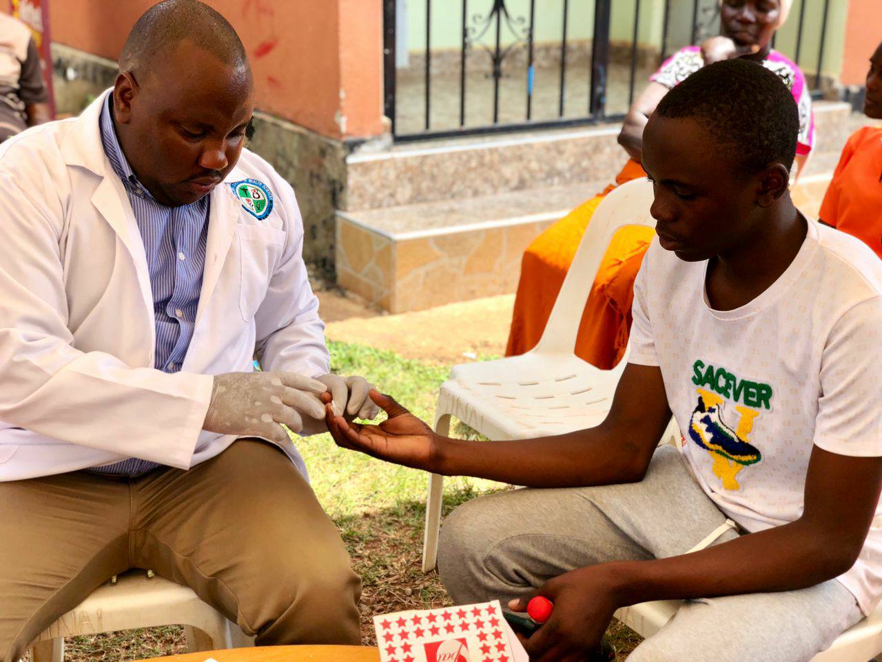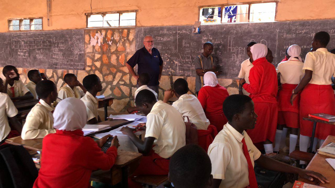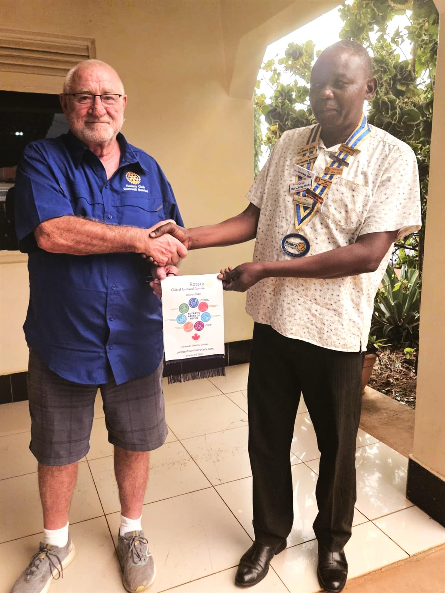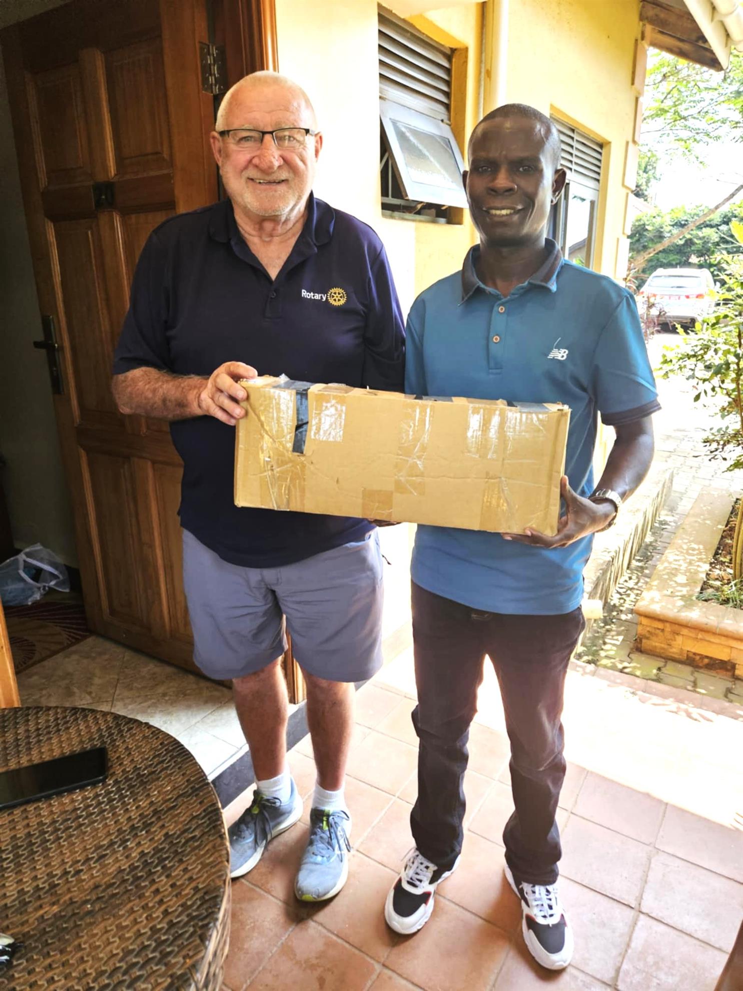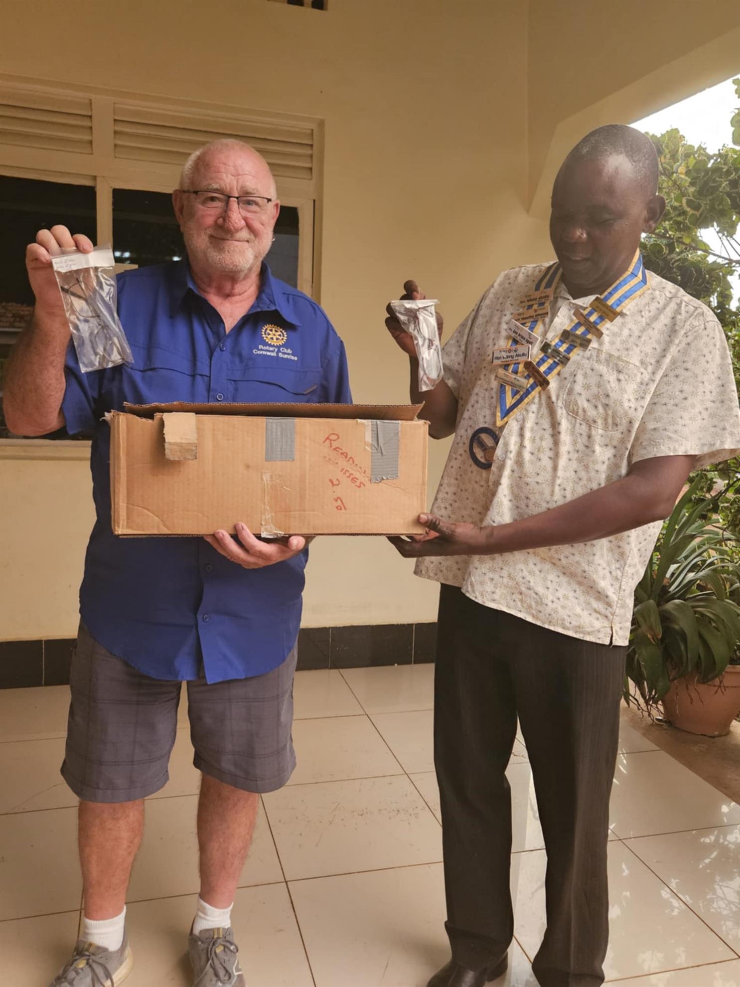 A highlight of this year’s (2025) visit to Kumi, North-eastern Uganda, was a visit to the school as well as the medical camp being conducted near Kumi. Roger’s visit coincided with the Family Health Day being conducted in the area where he met Kumi Rotary president, Etiang David. who received a large number of reading glasses that were then handed to the doctor managing the eye care service portion of the Day